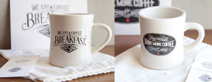 Limited edition silk screened diner mugs designed for New Zealand's Coffee Supreme, packaged with a print of the hand-lettered design.